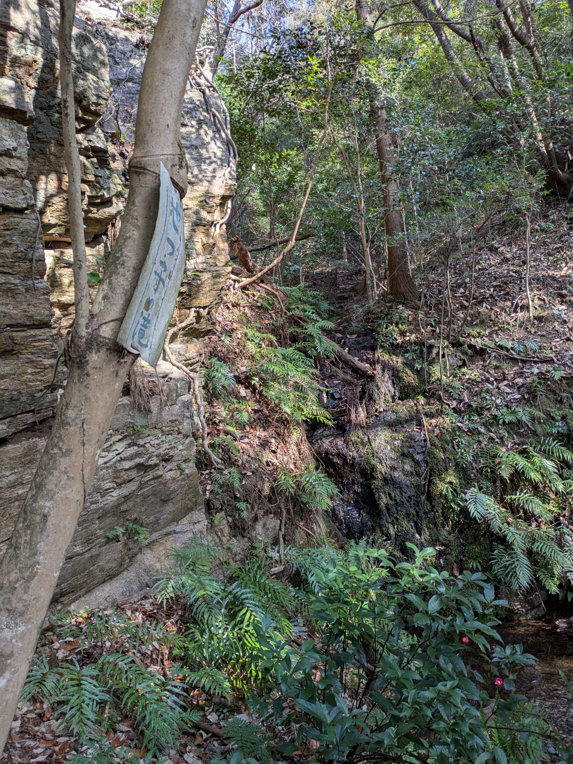 尾根によじ登り、景色のない尾根道を、プラスチックスプーンの目印をたどりながら展望地へ。