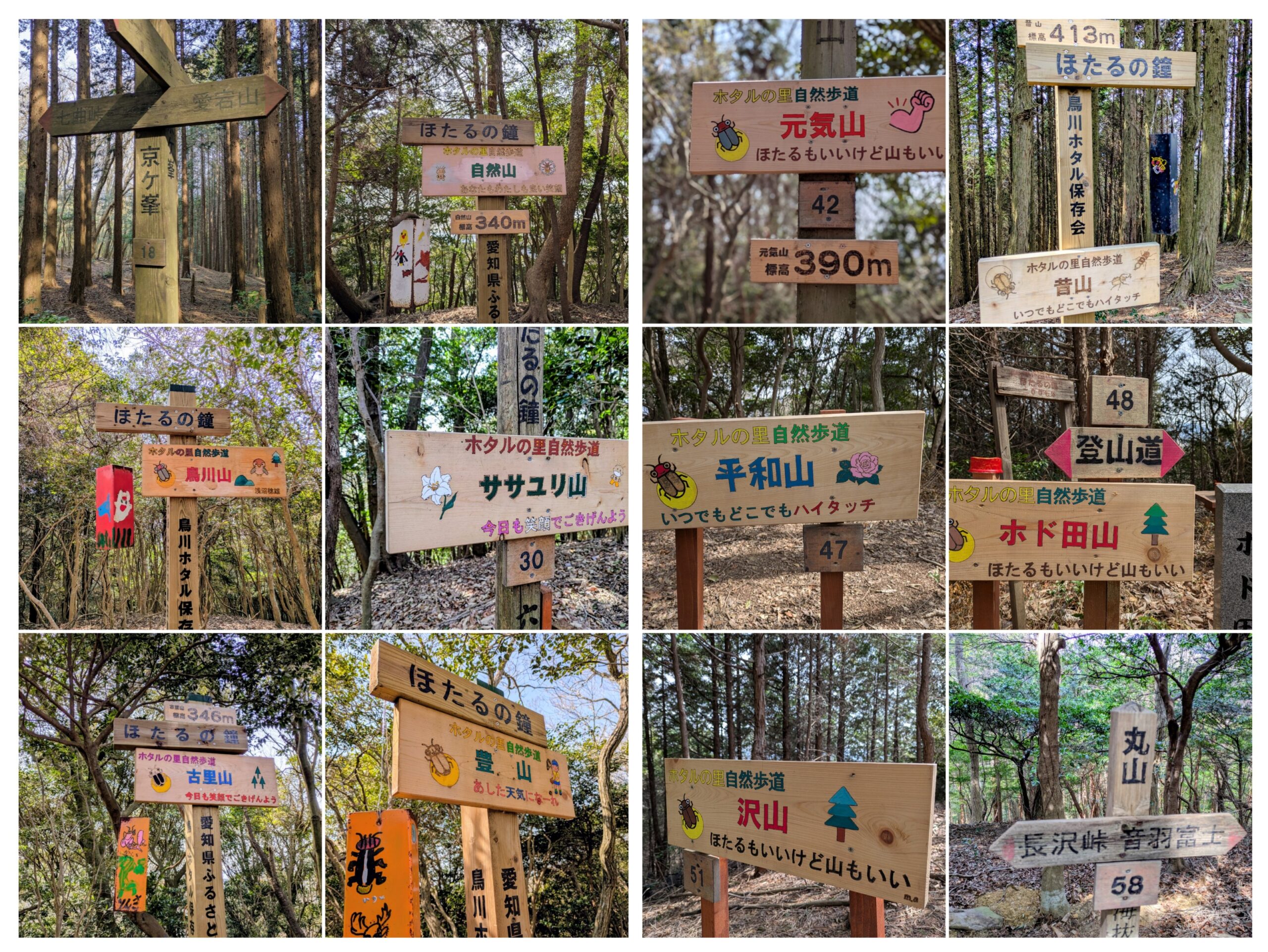 旧鳥川小学校の児童たちが名付けた山名のかわいい手作り看板、その横にかけられた「ほたるの鐘」は、それぞれ音色が異なって、麓の学校に届くことをイメージして作られました…そんなエピソードを聞いてしまったら、そりゃ、鳴らしながら歩くしかないでしょう。