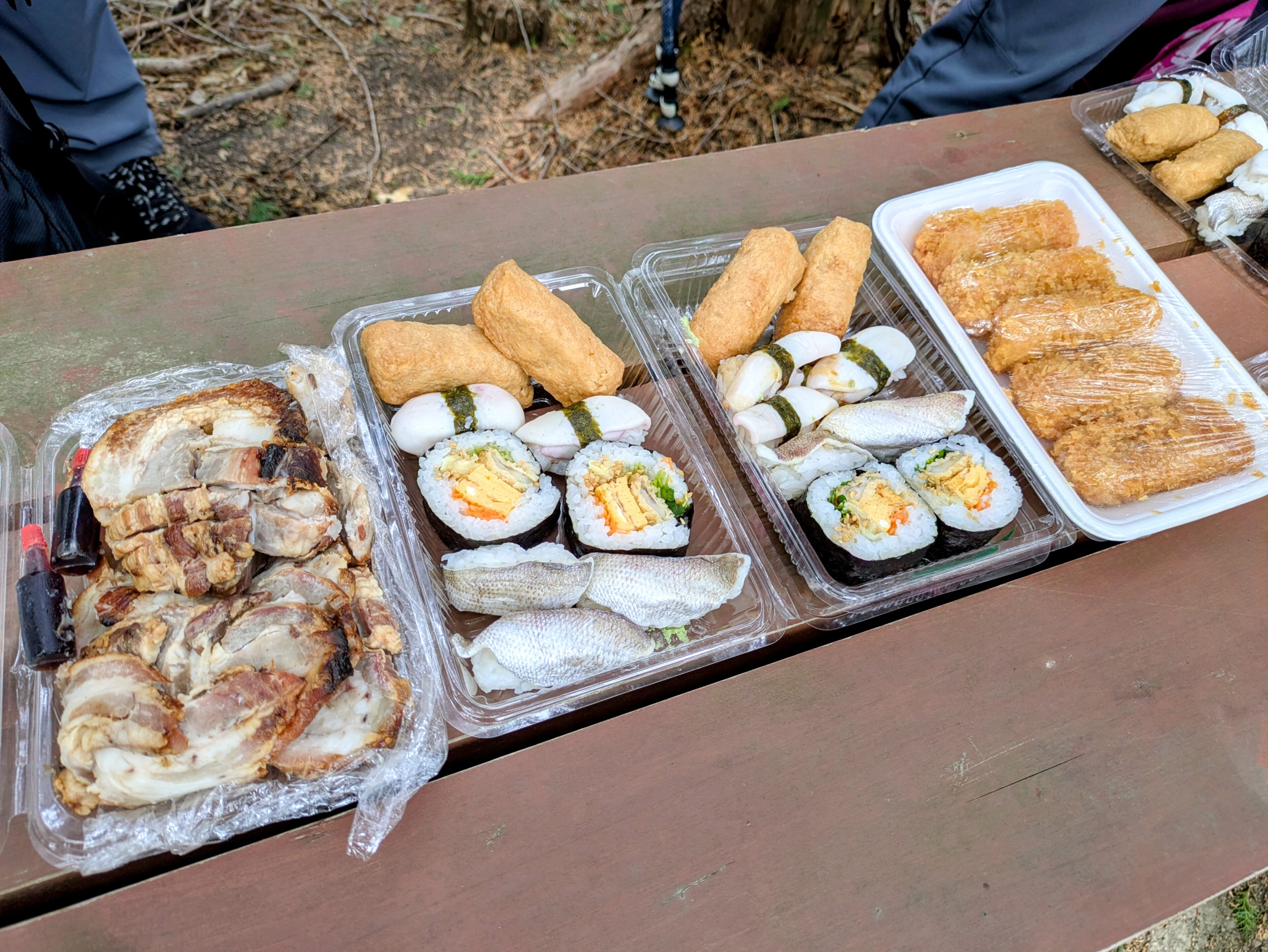 「一色さかな村」のお気に入りのお店で買った寿司四種(小いか、小鯛、にぎすの太巻き、いなり寿司)、イカフライのレモン煮、そして半田のお肉屋さんの絶品焼豚。